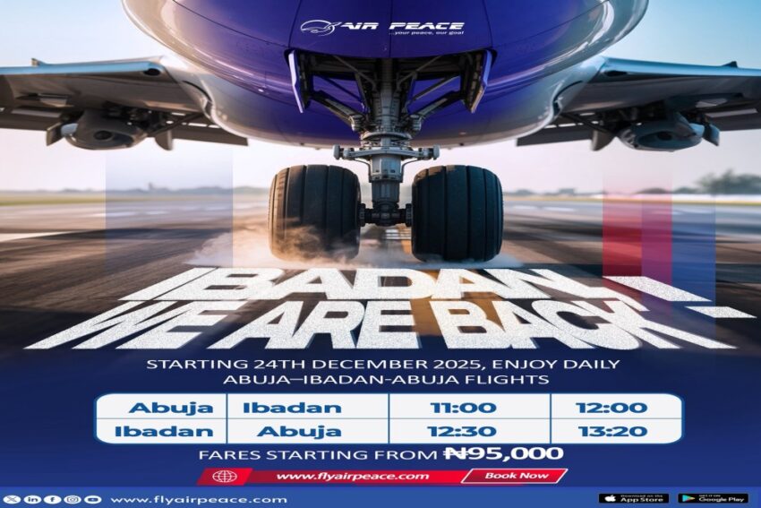 Air Peace said the move responds to renewed passenger demand for seamless, safe and time-efficient travel between the South-West and Abuja, particularly during the festive season when traffic volumes peak nationwide. The airline disclosed that fares on the Ibadan–Abuja route will start from N95,000, positioning the service as an affordable alternative to long and often risky road travel.