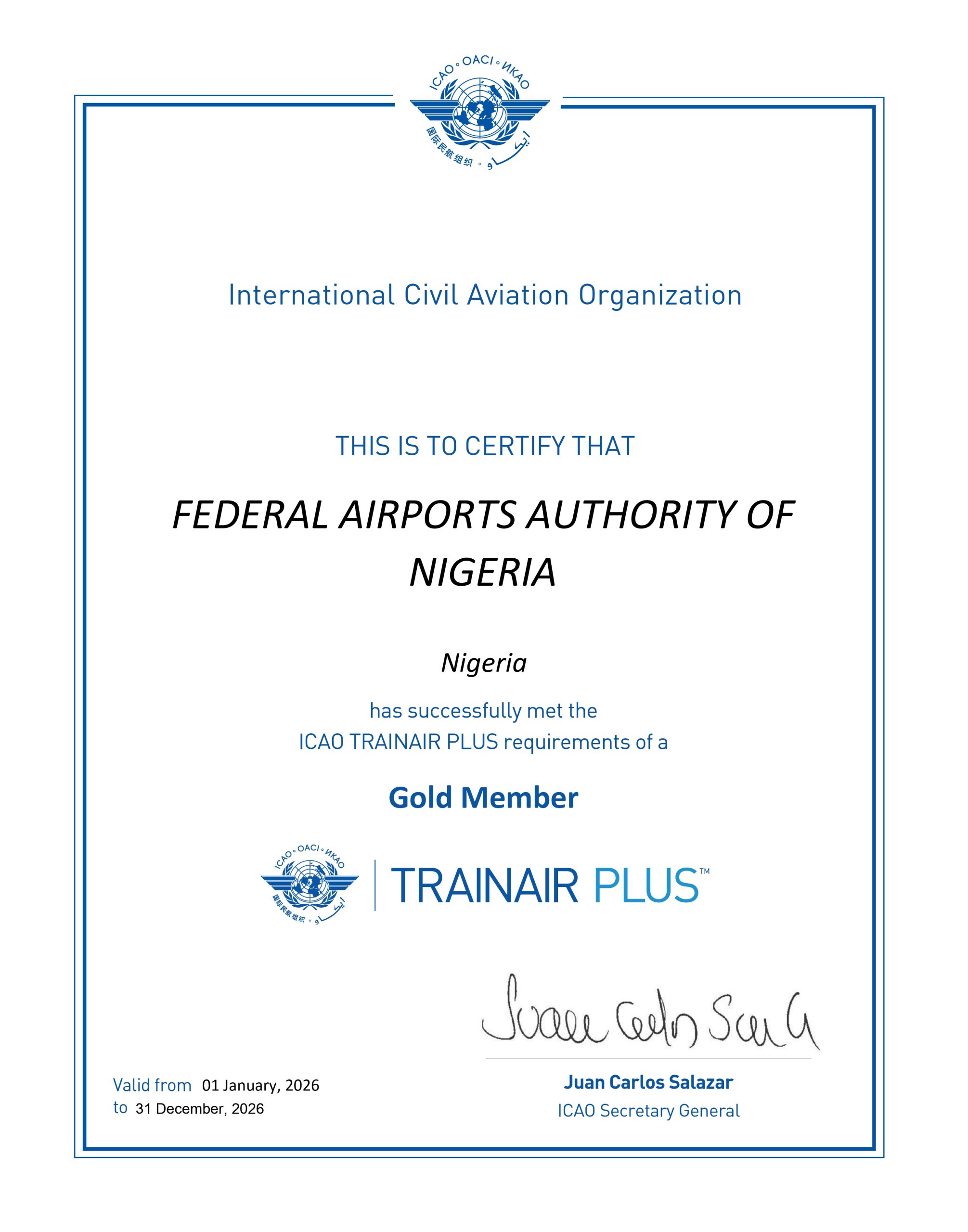 FAAN met all ICAO TRAINAIR PLUS requirements following a rigorous assessment process, earning a certification that is valid from January 1, 2026 to December 31, 2026. The Gold Member status represents global recognition of excellence in aviation training and confirms that FAAN’s training systems meet international standards for instructor competency, course development, training delivery and quality assurance.